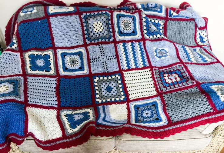 This was the result – a sampler blanket, learning a new technique every week & using it in ‘homework’ by crocheting squares. This blanket was much adored by me and surprisingly heavy. There were many times when I snuggled under it, comforted by its warmth and my sense of achievement. It is now (I hope) comforting refugees in Syria as I was moved by compassion for their plight believing they needed it more than I did. I co-ordinated a few of us to crochet(or knit) a large boxful of blankets and donated to SixtyMillionTrebles appeal. At the time there was an estimated sixty million refugees in the world (now the number is 68.5 million according to UNHCR, an increase of more than 10% in a few years!).