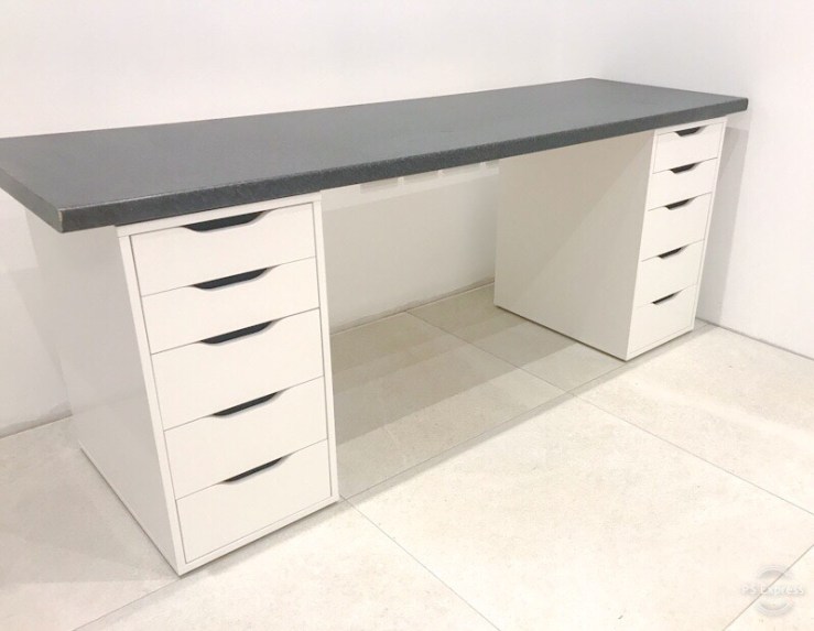 And here it is the final product – my desk. A leftover countertop plus 2 Ikea Alex units equals my new desk!