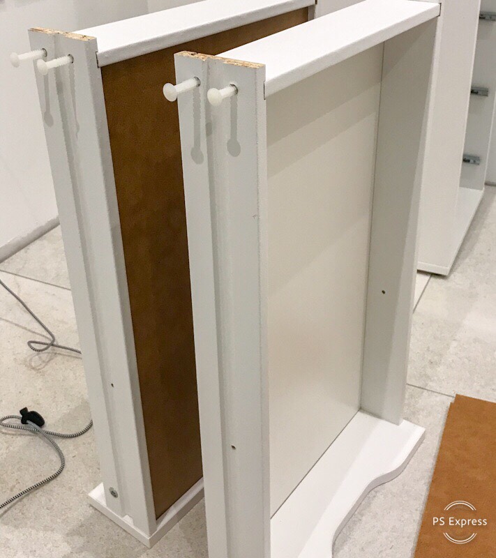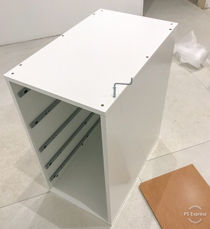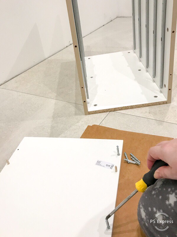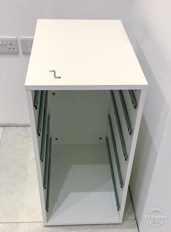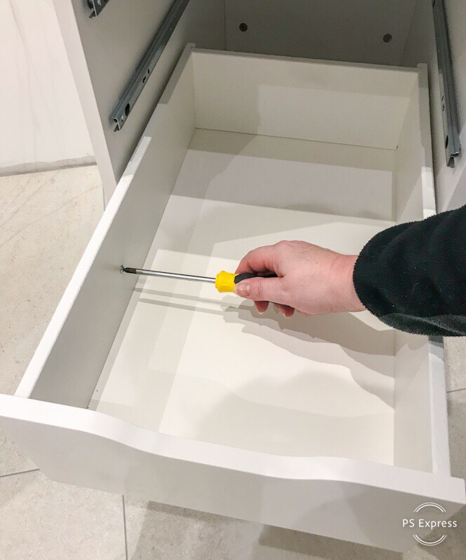After a few taps with the hammer, the drawers were ready. It’s best to pull out the drawer rails for getting the drawers in their places. 2 smaller drawers at the top and 3 larger on the bottom. Then pull the rail out to the end of the drawer and the final screw will keep it in place. It goes in from the inside of the drawer so as not to upset the sliding mechanism.