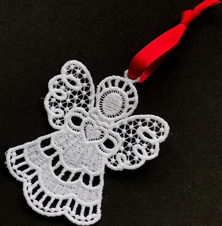 My favourite to make is this wee beauty – a white lace angel with vibrant red satin ribbon. She’s one of the first products I made and I love her for many reasons. She is one of the reasons I named my business #AngeLisaCrafts. Her construction is a technique which is called #freestandinglace. The pattern is embroidered onto water soluble stabiliser using my beloved sewing machine ‘Betsy’. Then the stabiliser is washed away leaving ‘lace’.